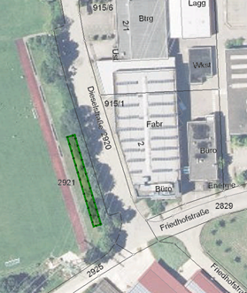Der Geltungsbereich umfasst Teile der Flurstücke Nr. 2920 (Dieselstraße) und 2921 (Sportplatz). Begrenzt wird der Geltungsbereich von dem Flurstück Nr. 915/6.