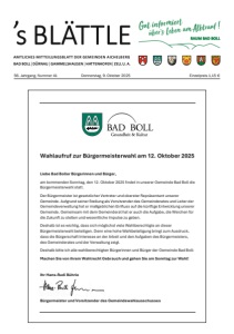 AMTLICHES MITTEILUNGSBLATT DER GEMEINDEN AICHELBERG BAD BOLL | DÜRNAU | GAMMELSHAUSEN | HATTENHOFEN | ZELL U. A. s BLÄTTLE Gut informiert uber s Leben am Albtrauf RAUM BAD BOLL 56. Jahrgang, Nummer 41 Donnerstag, 9. Oktober 2025 Einzelpreis 1,15 € Wahlaufruf zur Bürgermeisterwahl am 12. Oktober 2025 Liebe Bad Boller Bürgerinnen und Bürger, am kommenden Sonntag, den 12. Oktober 2025 findet in unserer Gemeinde Bad Boll die Bürgermeisterwahl statt. Der Bürgermeister ist gesetzlicher Vertreter und oberster Repräsentant unserer Gemeinde. Aufgrund seiner Stellung als Vorsitzender des Gemeinderates und Leiter der Gemeindeverwaltung hat er maßgeblichen Einfluss auf die künftige Entwicklung unserer Gemeinde. Gemeinsammit dem Gemeinderat hat er auch die Aufgabe, die Weichen für die Zukunft zu stellen und wesentliche Impulse zu geben. Deshalb ist es wichtig, dass sich möglichst viele Wahlberechtigte an dieser Bürgermeisterwahl beteiligen. Denn eine hohe Wahlbeteiligung bringt zum Ausdruck, dass die Bürgerschaft Interesse an der Arbeit und den Aufgaben des Bürgermeisters, des Gemeinderates und der Verwaltung zeigt. Deshalb bitte ich alle wahlberechtigten Bürgerinnen und Bürger der Gemeinde Bad Boll: Machen Sie von ihremWahlrecht Gebrauch und gehen Sie am Sonntag zur Wahl! Ihr Hans-Rudi Bührle Bürgermeister und Vorsitzender des Gemeindewahlausschusses