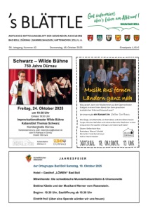 AMTLICHES MITTEILUNGSBLATT DER GEMEINDEN AICHELBERG BAD BOLL | DÜRNAU | GAMMELSHAUSEN | HATTENHOFEN | ZELL U. A. s BLÄTTLE Gut informiert uber s Leben am Albtrauf RAUM BAD BOLL 56. Jahrgang, Nummer 42 Donnerstag, 16. Oktober 2025 Einzelpreis 1,15 € Was passiert, wenn vier MusikerInnen aus dem Opernorchester Stuttgart an einem freien Abend über ihren gewohnten musikalischen Tellerrand hinausschauen? Die Antwort gibt ein Konzert im Zeller Dorfhaus. Eine Geige, eine Klarinette, ein Kontrabass und eine Gitarre lassen Tangos, Klezmer-Melodien und südamerikanische Rhythmen in einer entspannten Atmosphäre erklingen und haben Spaß dabei! Gitarre: Stefan Koch-Ross Kontrabass: Manuel Schattel Klarinette: Frank Bunselmeyer Violine: Muriel Bardon Musik aus fernen Ländern ganz nah Samstag, 18. Oktober, 19 Uhr J A H R E S F E I E R der Ortsgruppe Bad Boll Samstag, 18. Oktober 2025 Hotel – Gasthof „LÖWEN“ Bad Boll Mitwirkende: Die schwäbische Mundartkabarettistin & Chansonette Bettina Kästle und der Musikant Werner vom Rosenstein. Beginn: 19.30 Uhr, Saalöffnung ab 18.30 Uhr Eintritt frei! (über eine Spende würden wir uns freuen)